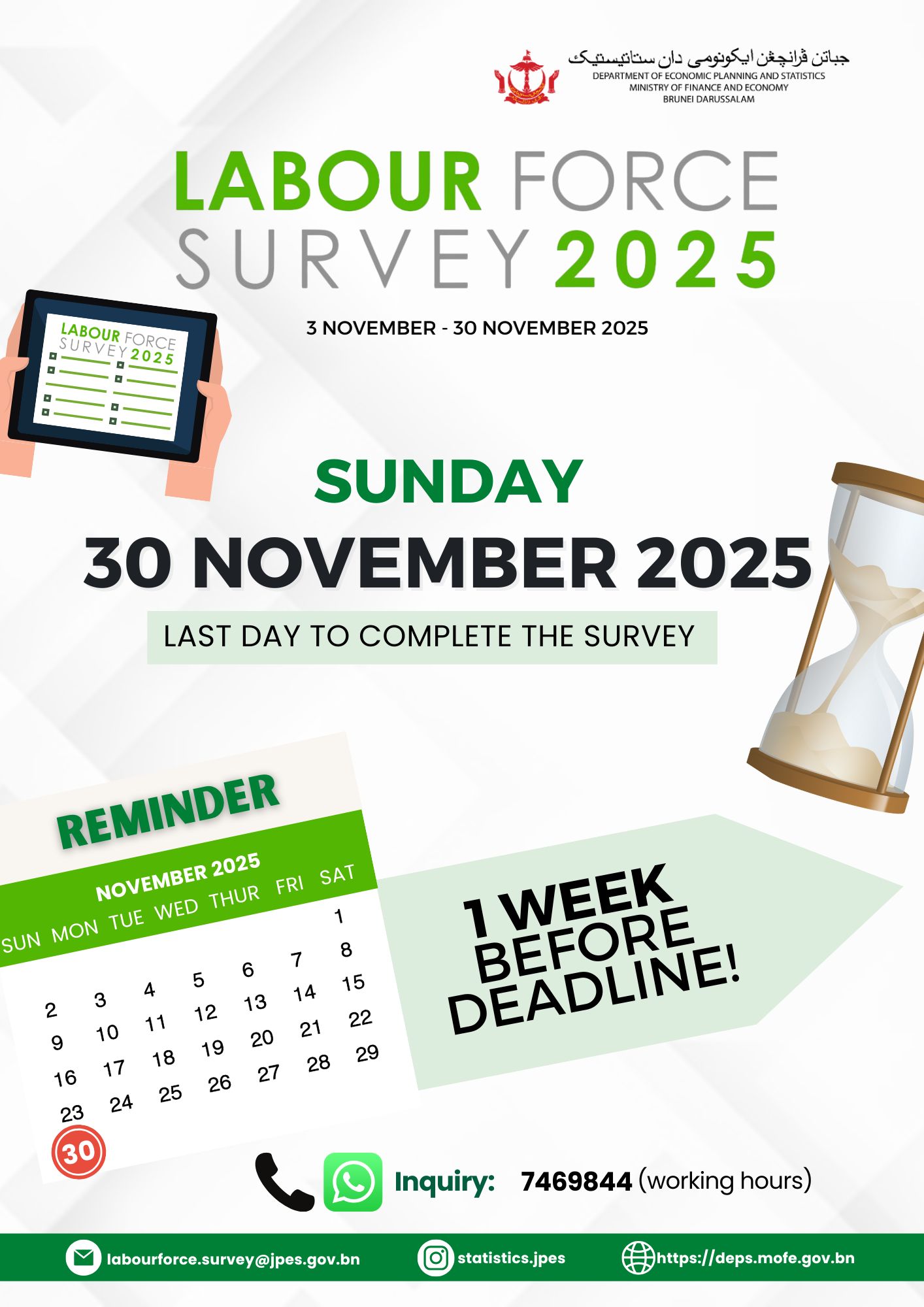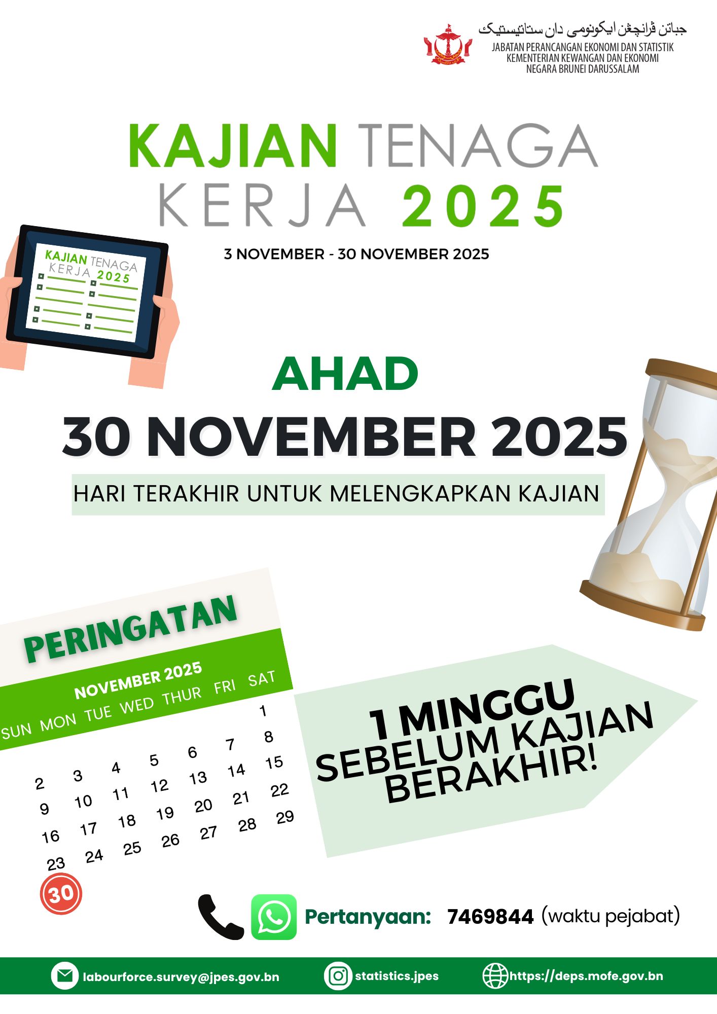 JPES amat menghargai sokongan dan kerjasama isi rumah terpilih bagi memastikan perangkaan tenaga kerja yang tepat — asas kepada perancangan dan pembangunan dasar pasaran tenaga kerja yang menyokong kemajuan negara.