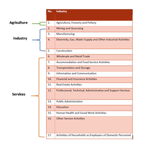 The indicator for employment by sector divides employment into three broad groupings of economic activity: Agriculture, Industry and Services. Economic activity i.e industry group is classified according to Brunei Darussalam Standard Industrial Classification (BDSIC) 2011 which is compatible with ISIC (Revision 4).