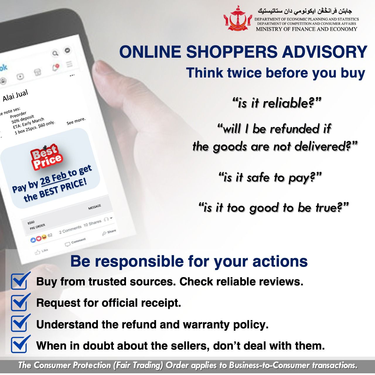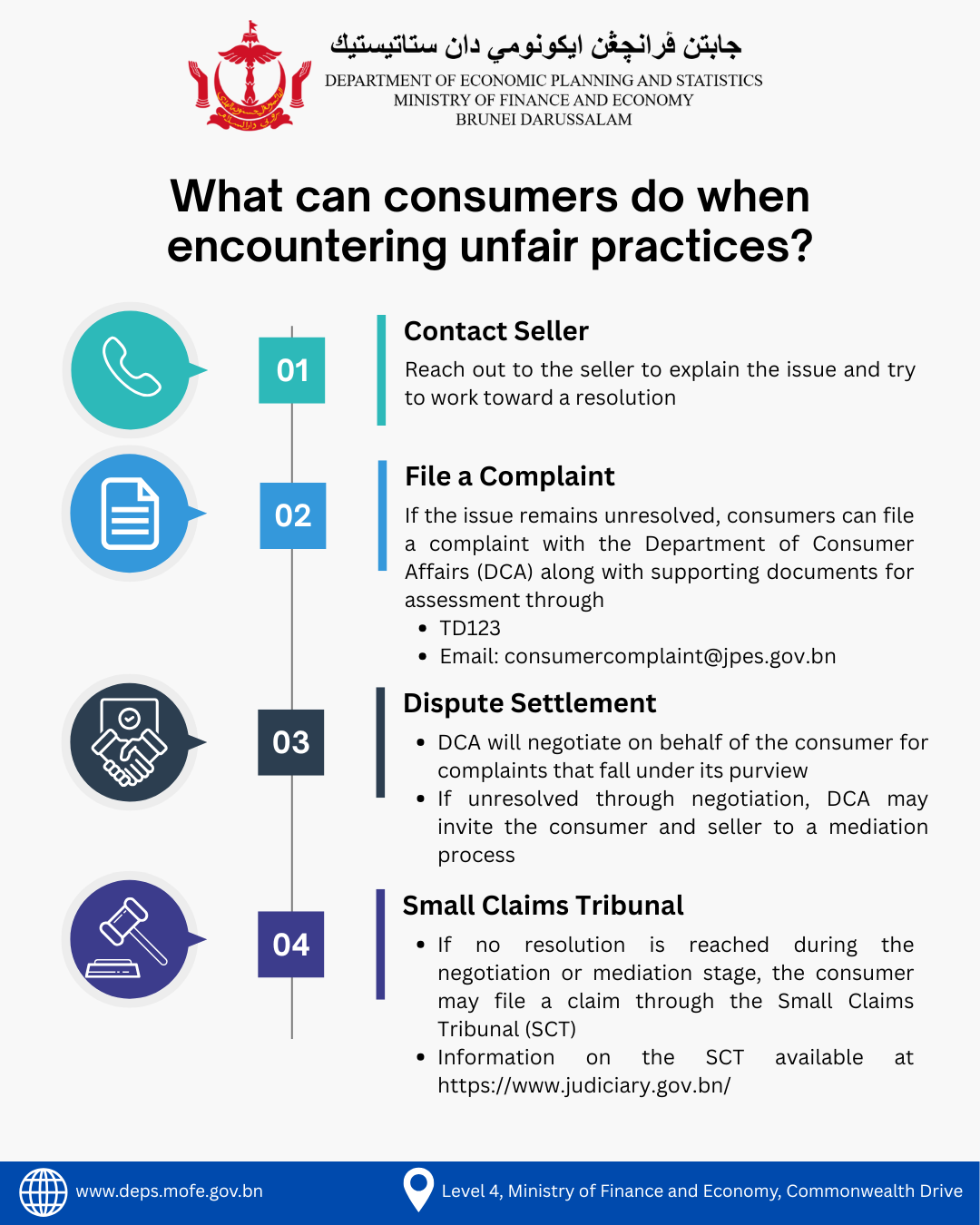 Alternatively, consumers who encounter unfair practices may seek recourse from the Small Claims Tribunal (SCT) for claims up to B$10,000. More information on the Small Claim Tribunal can be found at: https://www.judiciary.gov.bn/