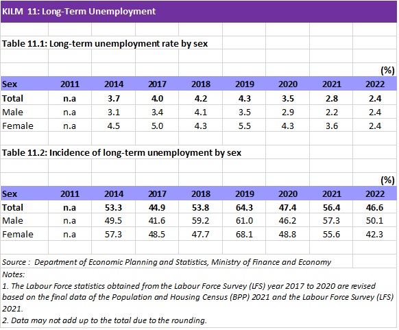 The indicators on long-term unemployment look at duration of unemployment, that is, the length of time that an unemployed person has been without work, available for work and looking for a job. KILM 11 consists of two indicators to evaluate unemployment: