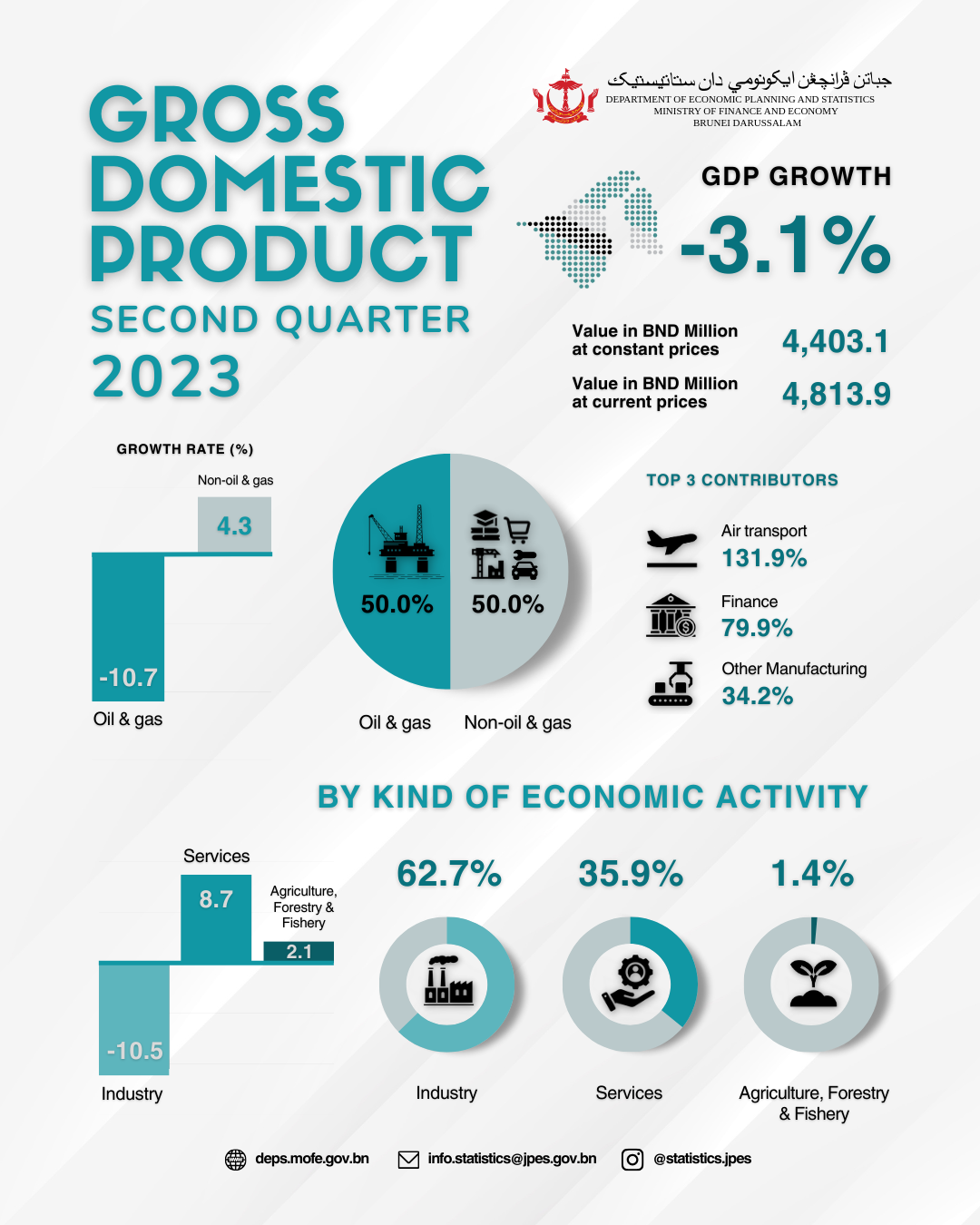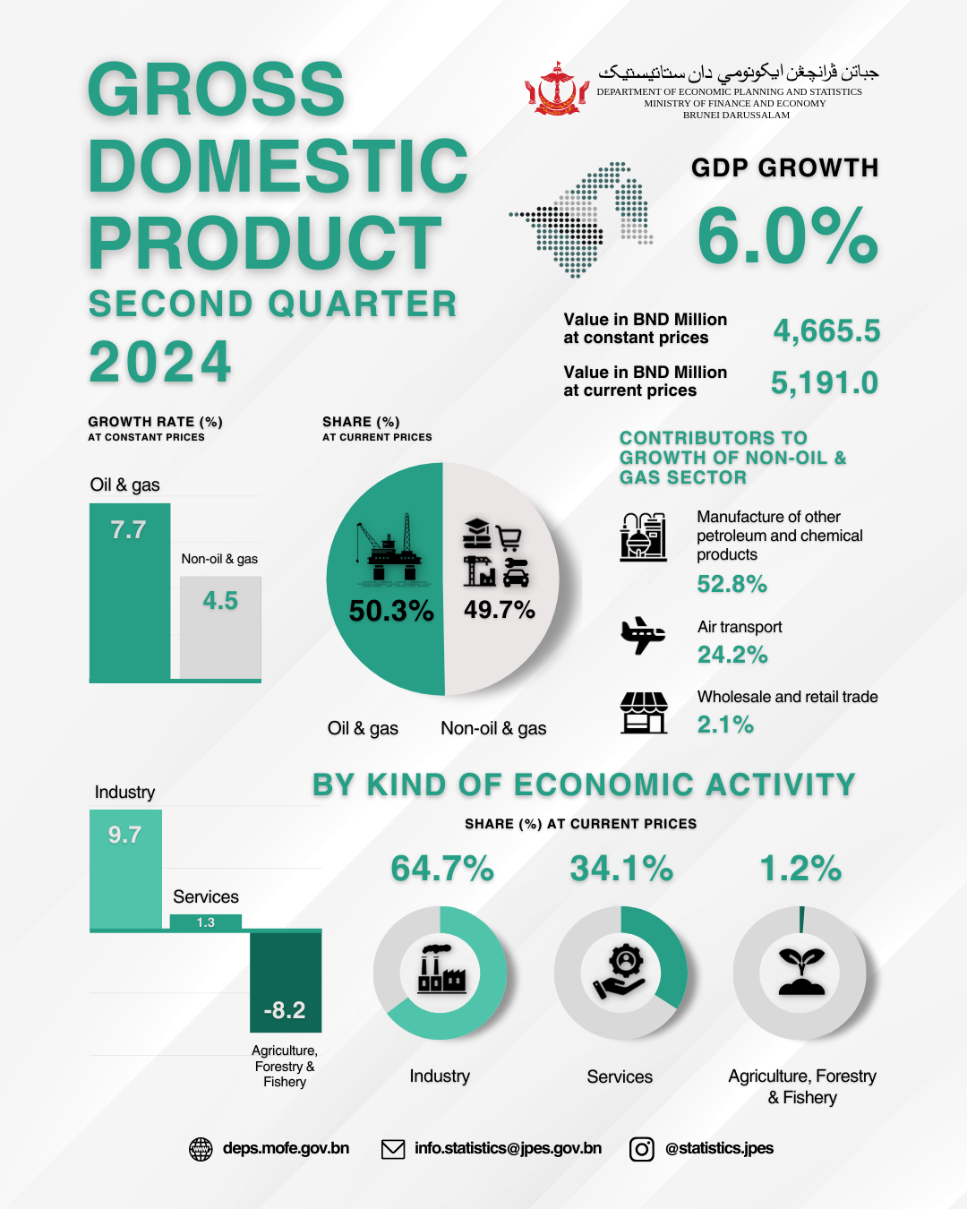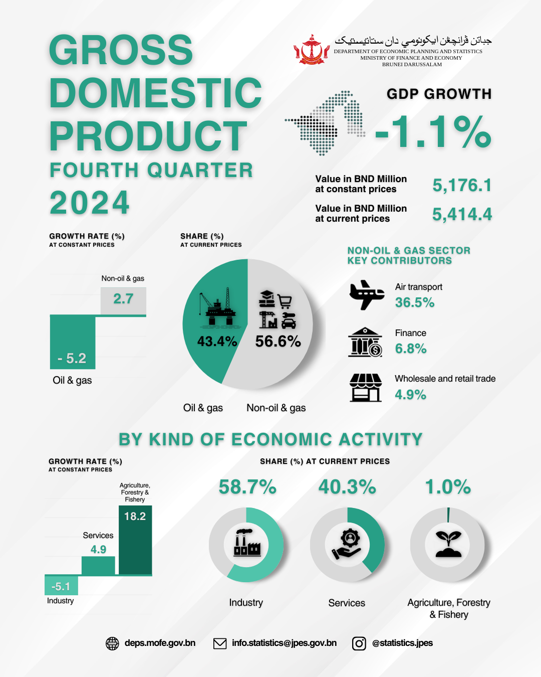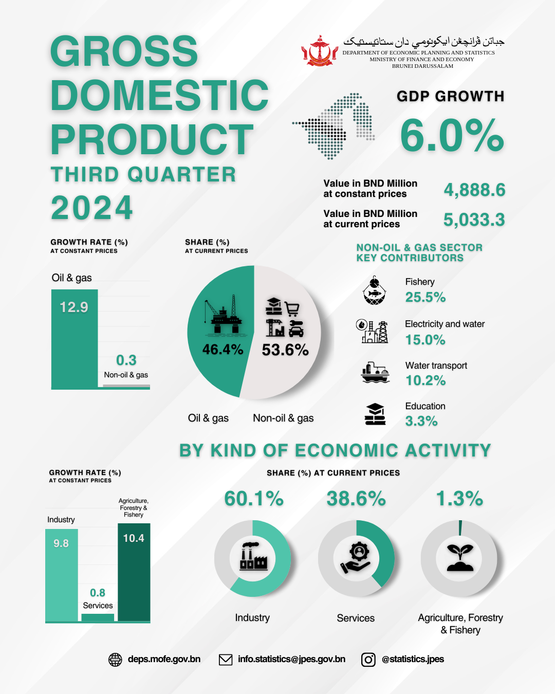 GDP at current prices (measured at prevailing prices during the period) was estimated at BND4.8 billion in Q3 2025, compared to BND5.0 billion in Q3 2024.