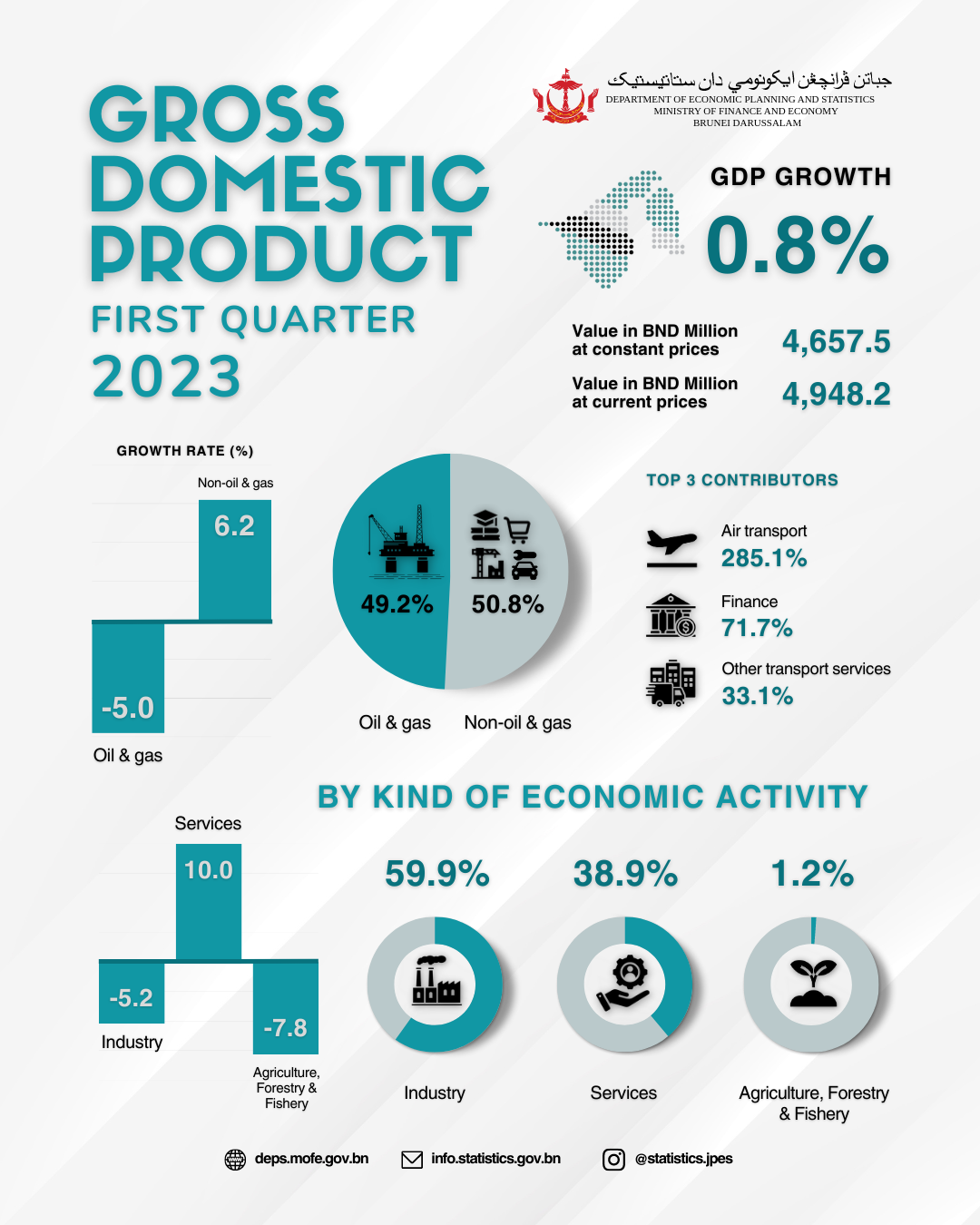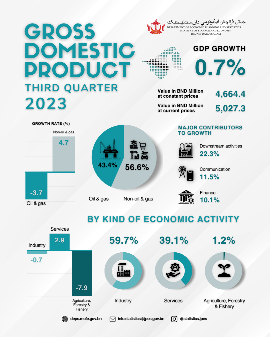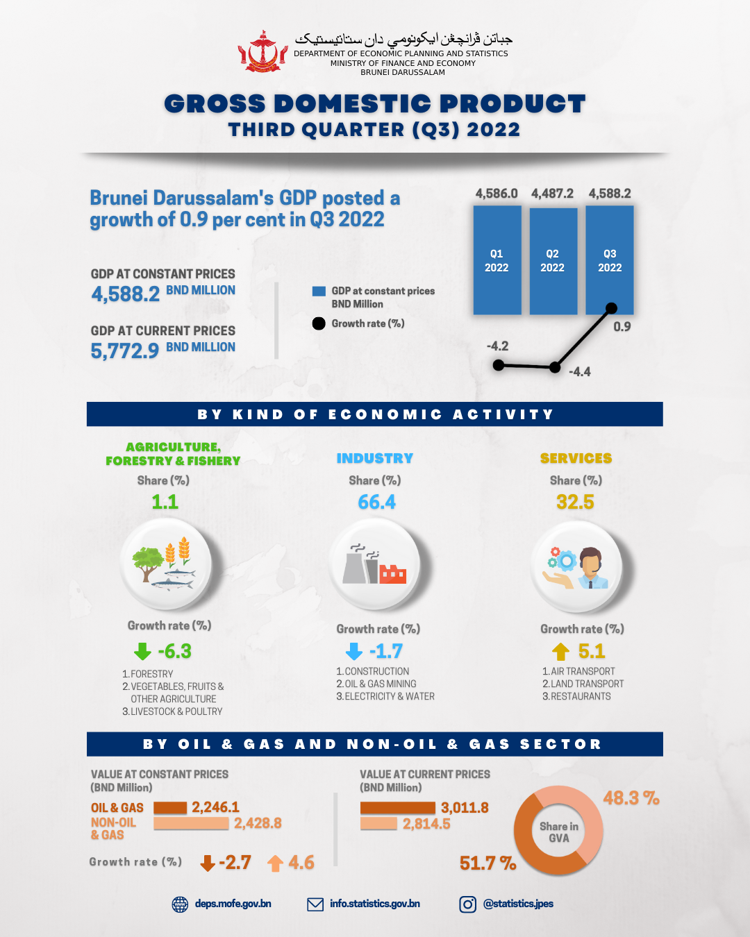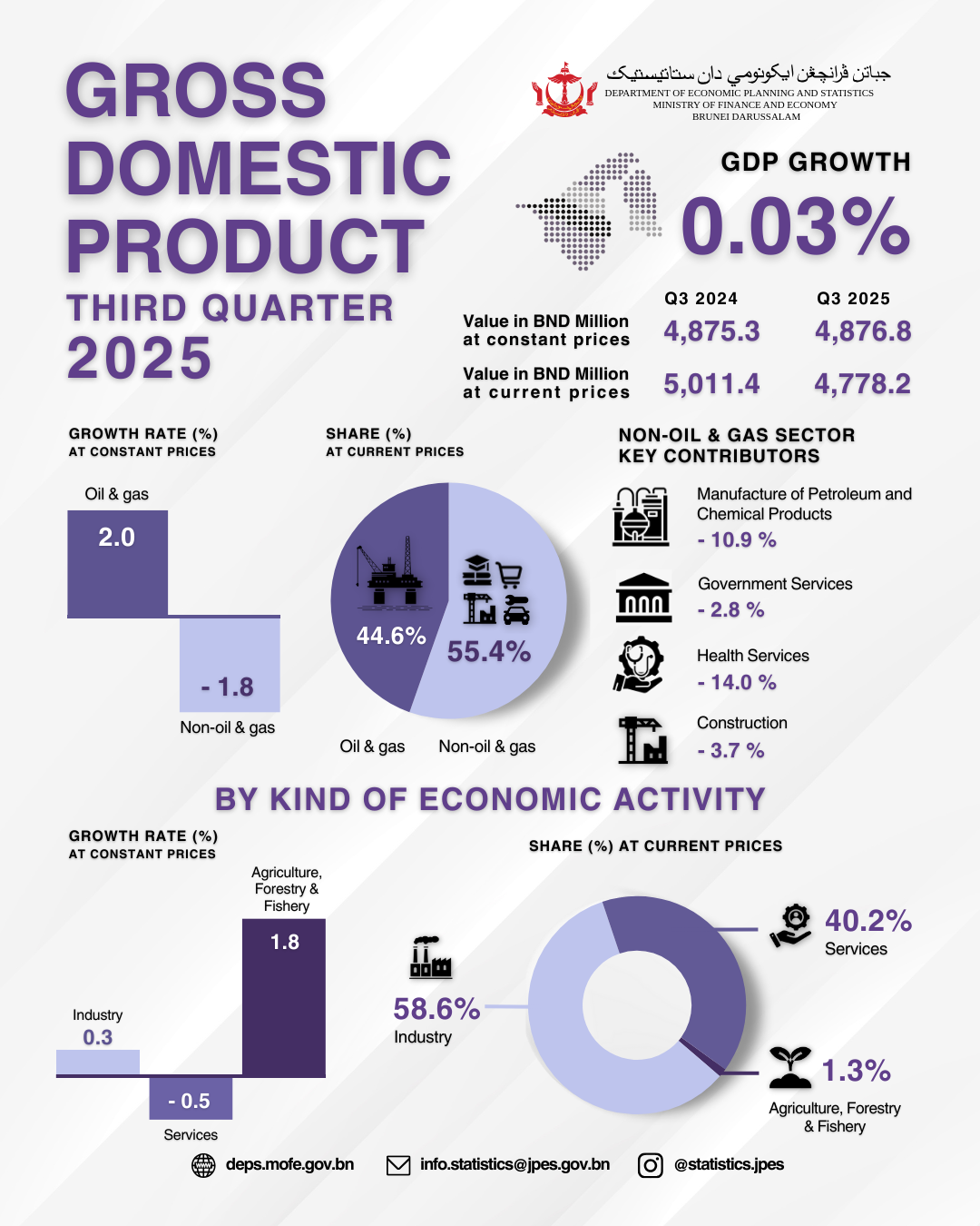 In the third quarter of 2025 (Q3 2025), Brunei Darussalam’s Gross Domestic Product (GDP) posted a positive growth of 0.03 per cent year-on-year at constant prices (measured at 2010 base year prices).