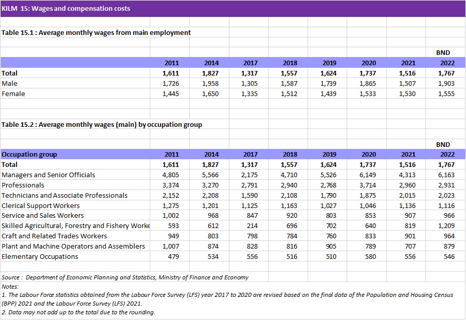KILM15 presents two distinct and complementary indicators. The first, Table 15.1, shows trends in average monthly wages in main job, while the second, Table 15.2, presents the trends and structure of employers’ average monthly earnings for the employment of workers.